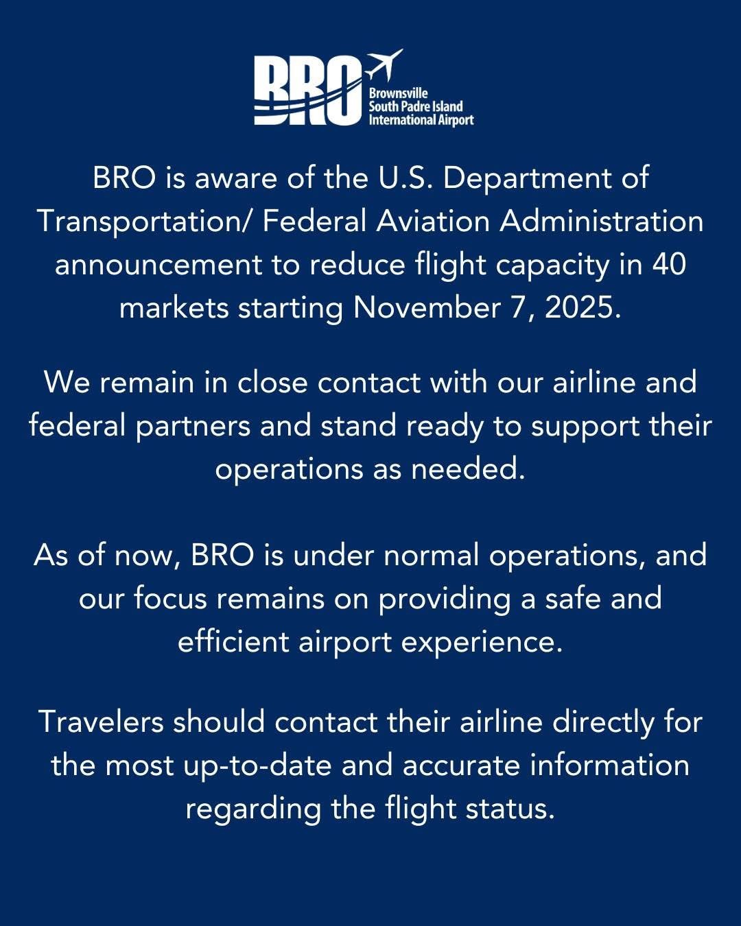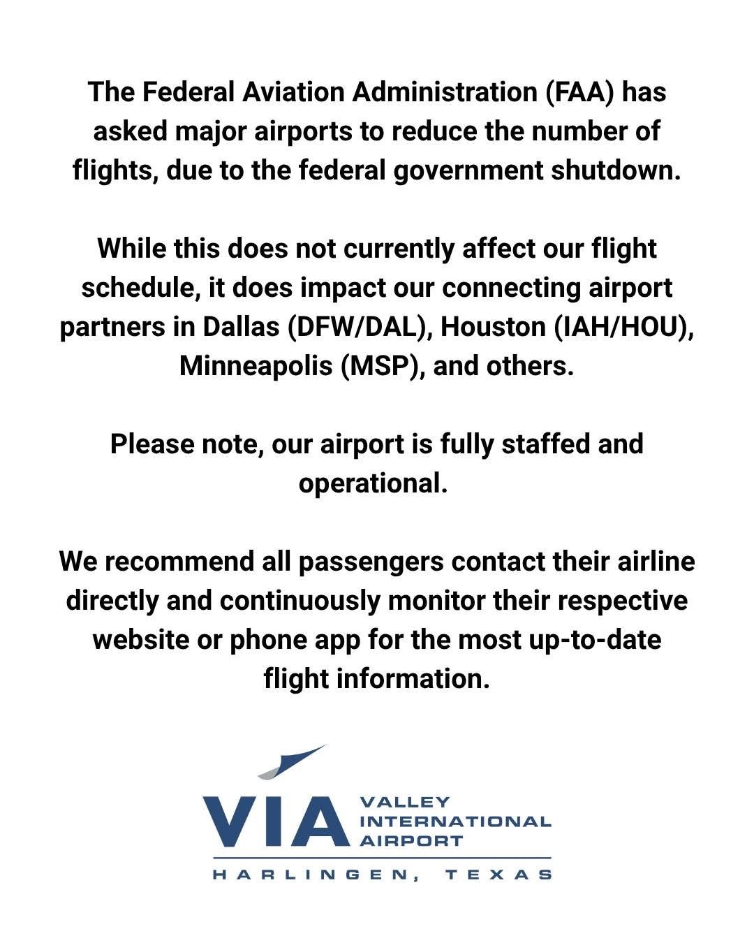 The FAA has announced flight capacity reductions in 40 markets, including major hubs like Dallas (DFW/DAL) and Houston (IAH/HOU), starting today, November 7, due to the federal government shutdown. While both the Brownsville (BRO) and Harlingen (VIA) airports report that they are fully staffed and under normal operations, these national reductions will likely impact connecting flights. All passengers are strongly advised to contact their airline directly or continuously monitor their airline's website or app for the most up to date and accurate information regarding their flight status.