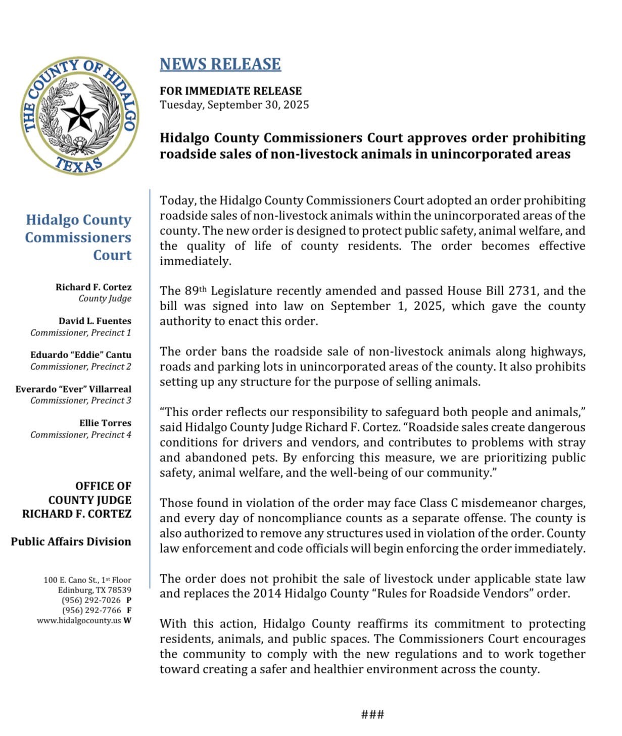 Today, Hidalgo County Commissioners Court adopted an order to prohibit the roadside sale of non-livestock animals in unincorporated areas, effective immediately.